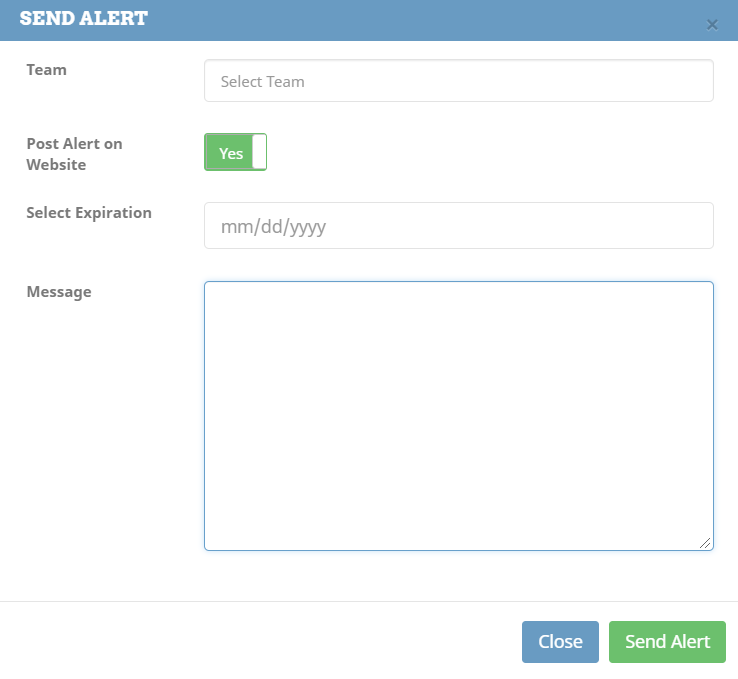 - When you click “Send Alert”, a pop up screen appears that lets you select a team, choose whether the alert gets posted on the team website, select an expiration date for the alert, and have the actual message description.