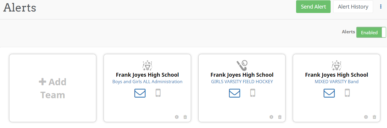 - A new page will open up and show what teams already have alerts set up and you also have the ability to add new alerts by clicking “Send Alert” at the top right.