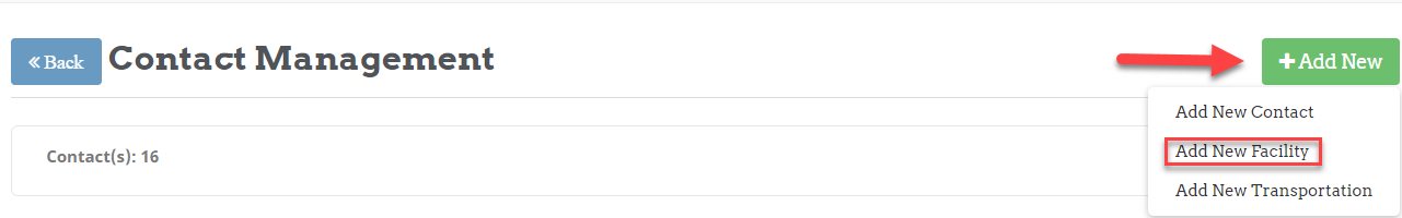 From your homepage click on “Administration” and then under “School Users / Contacts” click on “Contacts/Facilities/Transportation”. On this page you will be able to add a new facility and edit any existing ones registered by clicking on “Add New” at the top right hand side and select “Add New Facility” in the drop down tab. You can also add a facility while you are adding a new event.
